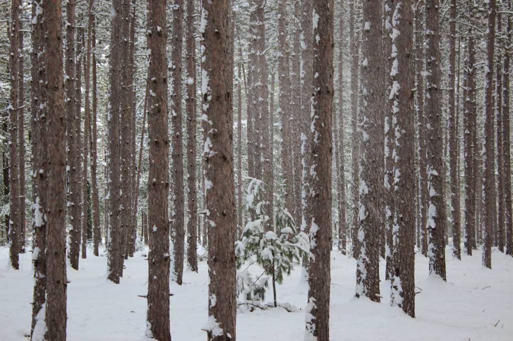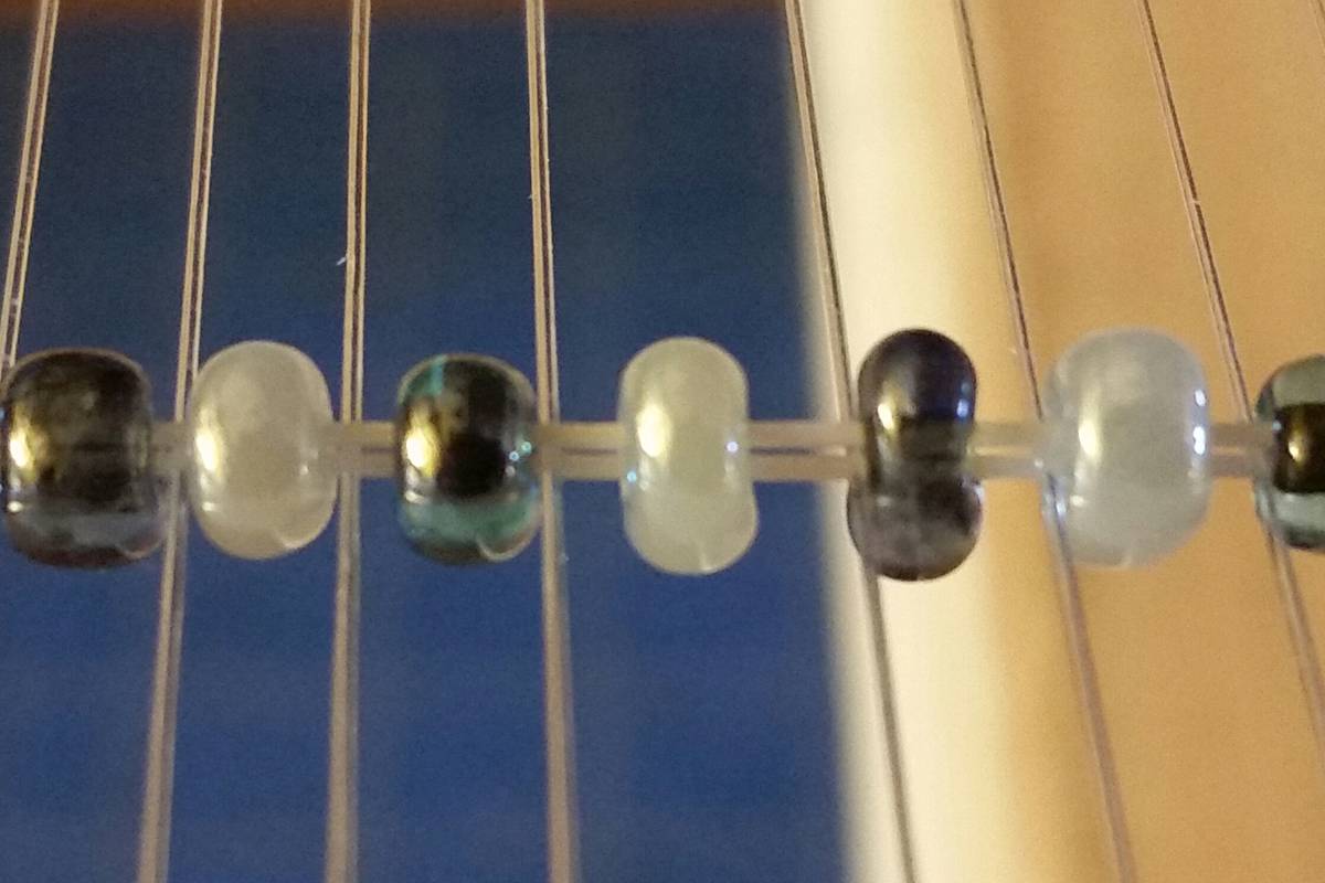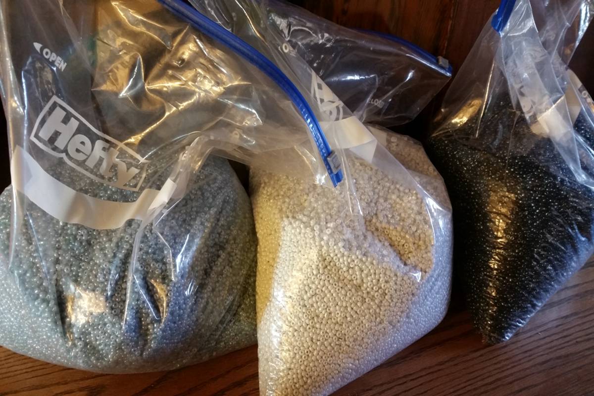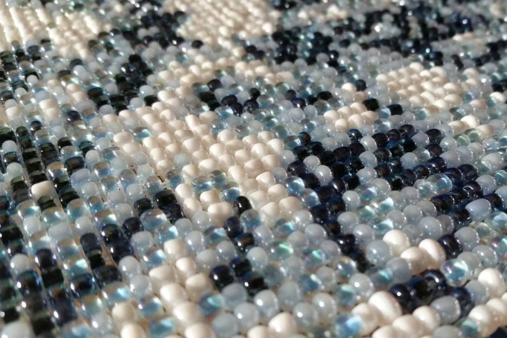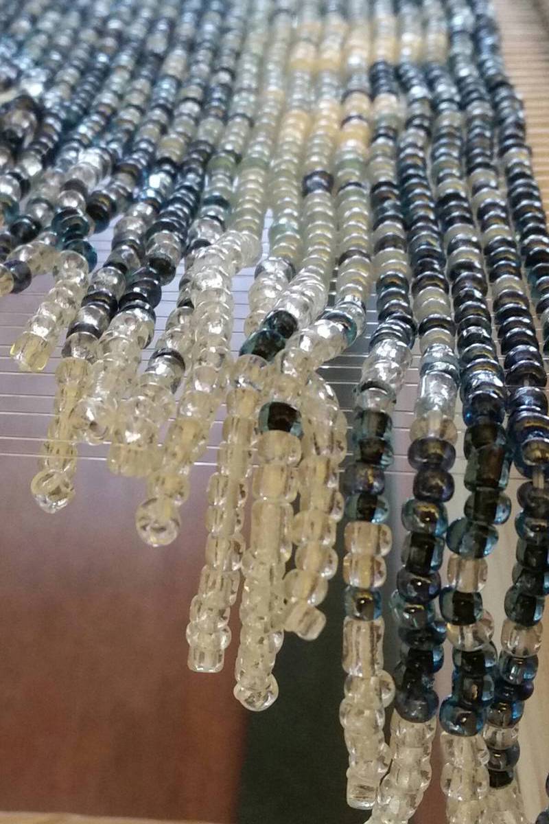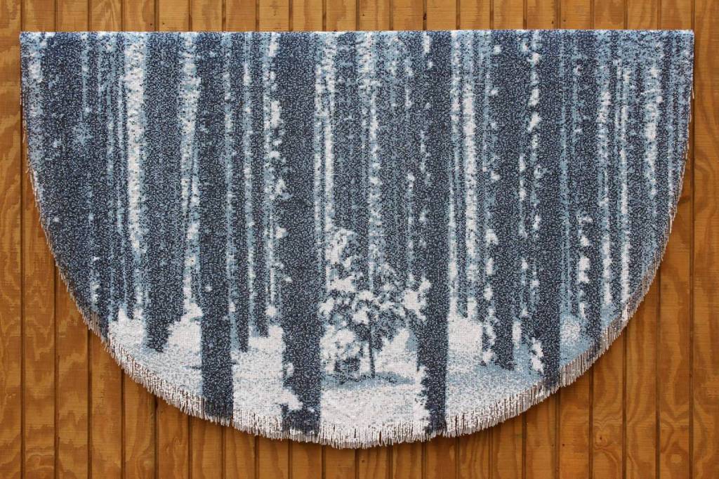 (168,603 glass beads • approx. 7′ x 4′ x 1.5″ • approx. 40 lbs.) Glass bead shawl depicting a winter snow scene in northwest Michigan. Voted “Top 20” for 2D during ArtPrize Nine in Grand Rapids, Michigan.The original winter photograph which inspired lllll.still.lllllClose-up view. Beads in high quantities are required.Close-up view of the clear beads added to simulate icicles while on the loom.Extreme close-up showing how the beads are strung — twice — once on the back and again on the front to lock the beads onto the warp threads.